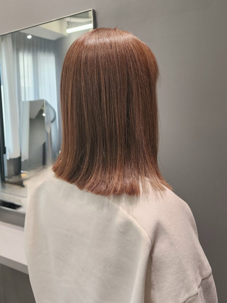 ベースは肩についてハネやすい長さのボブ。段はなく乾かすだけでもハネやすいようにカット。段がないことで、ツヤ感アップ! 伸びても長持ちしやすいヘアスタイルです。