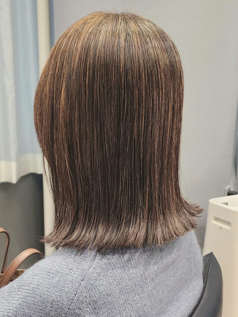 セルフカラーでも外ハネボブはおしゃれにきまります!こちらの方はご自宅でカラートリートメントで定期的に白髪対策。明るい部分が白髪のある箇所ですが、白髪がハイライトような役割で、外はねストレートのシンプルなスタイルに立体感をもたせます。