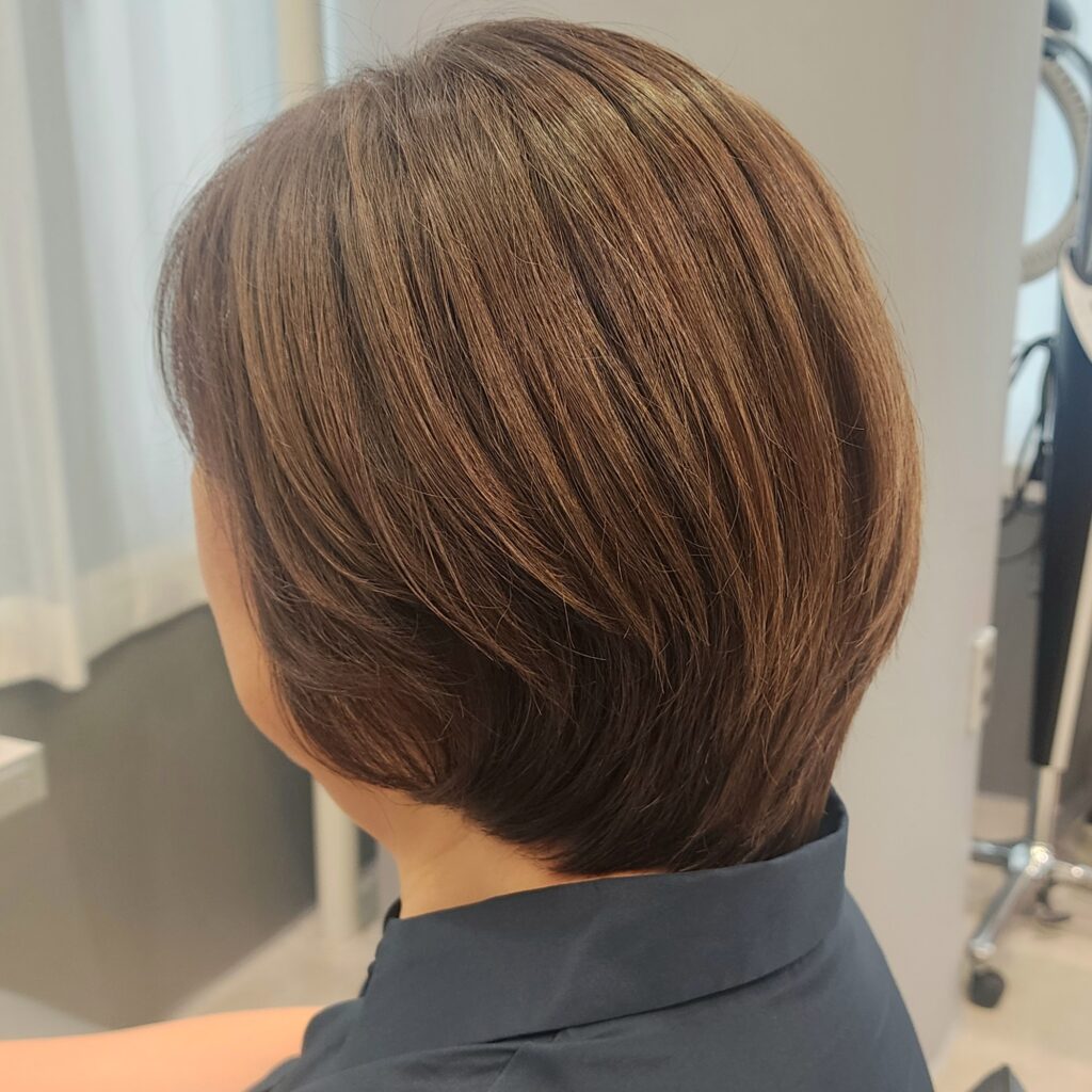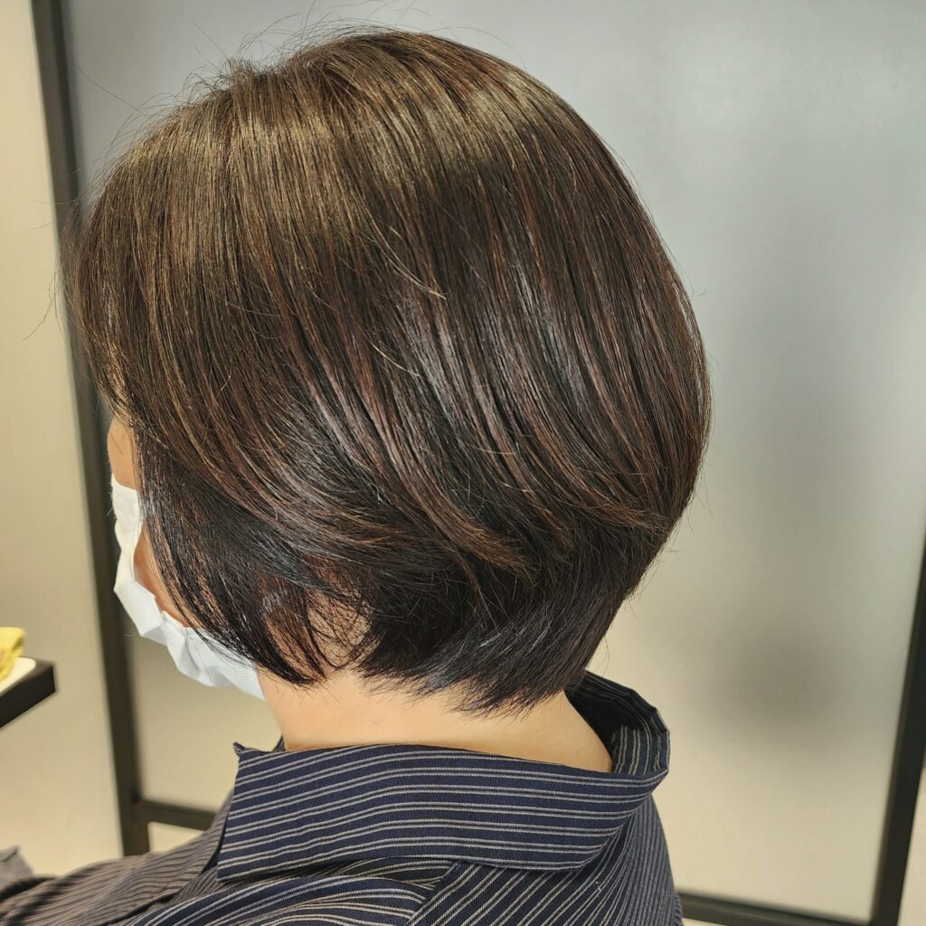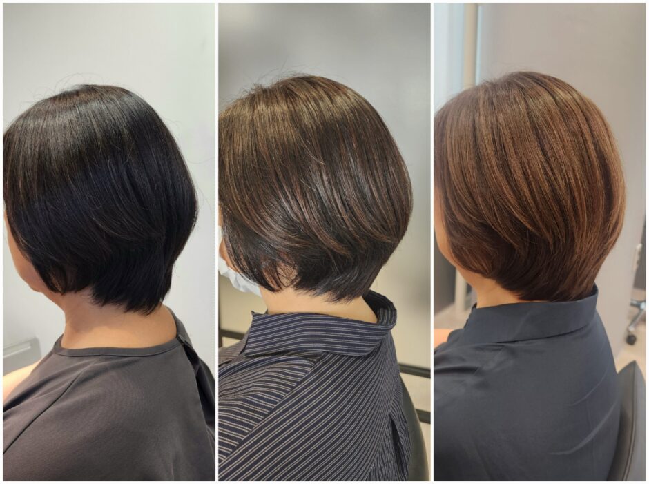 毛先部分をカットをすることで白髪染め部分がなくなり、さらに少しずつ明るくなり、暗めの白髪染めがなくなってきます。