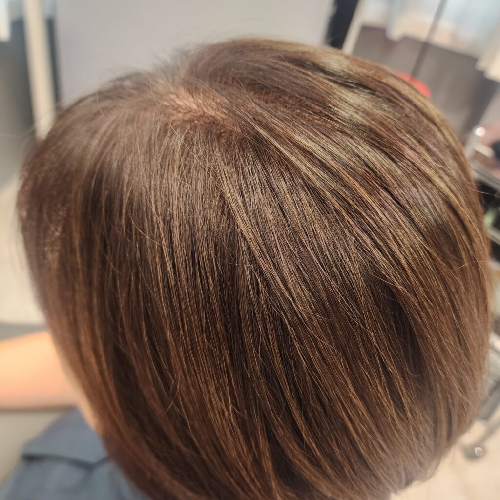 長年暗めの白髪染めをしていたため明るくなりにくいのですが、急には変えたくないと言う希望もあり、毛先が少しずつ明るくなるようにおしゃれ染めの明るいトーンでカラー。