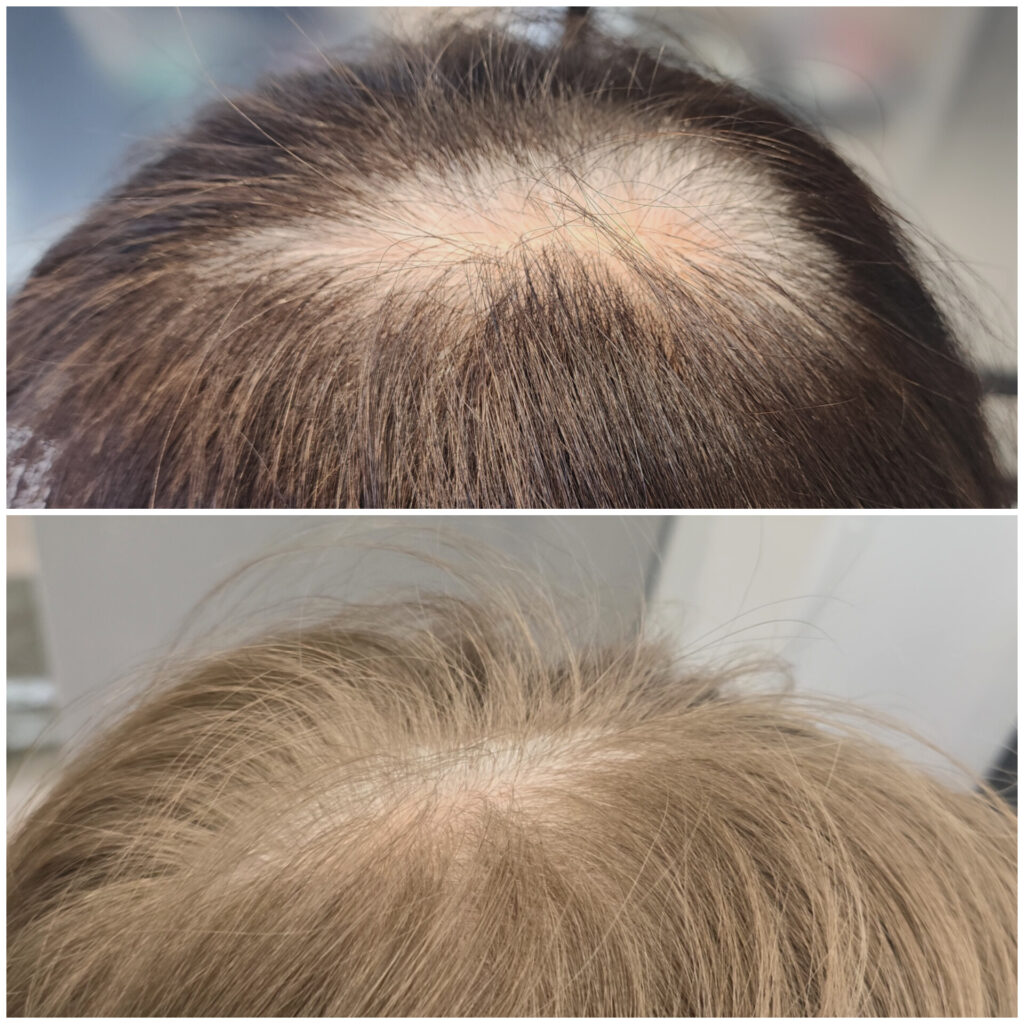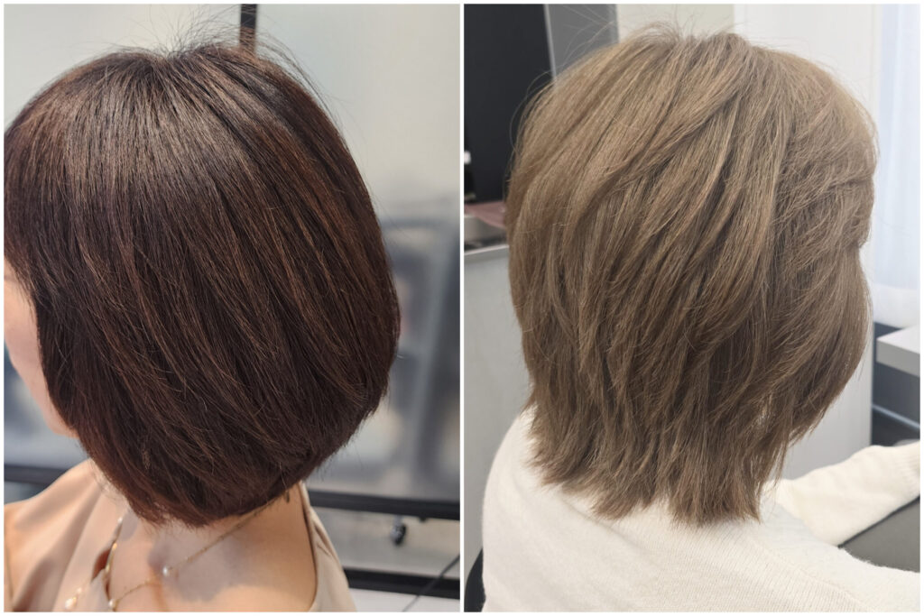 同じ方なのですが左は暗めの白髪染めで染めていた時期、右は現在の状態で明るめのカラーにして白髪が目立たないようにしています。